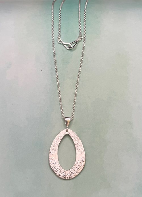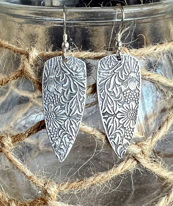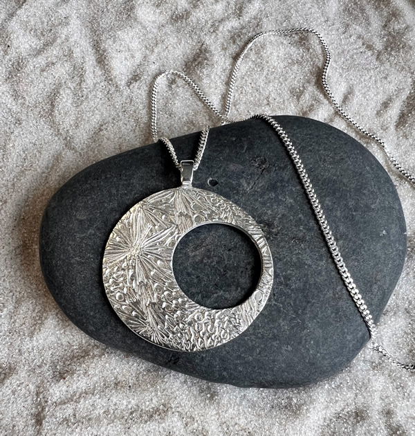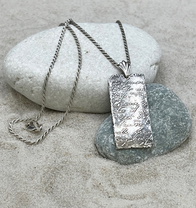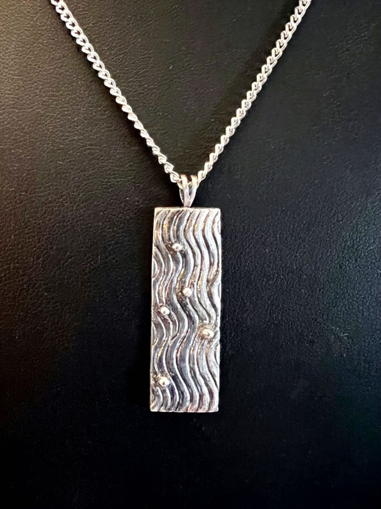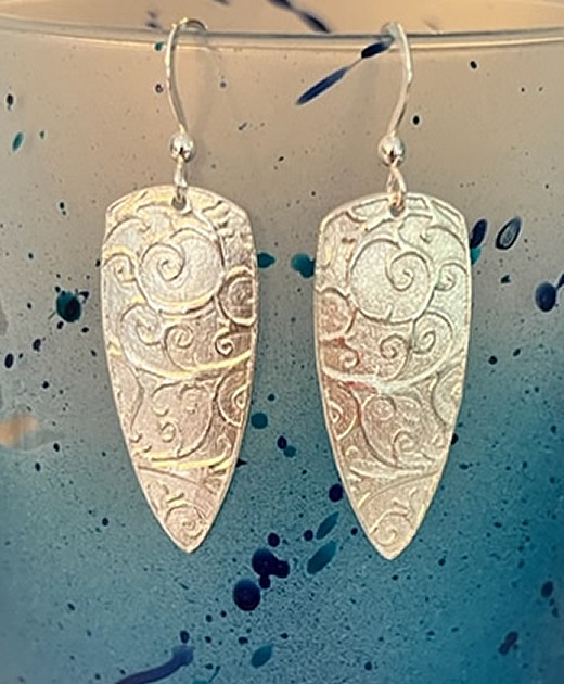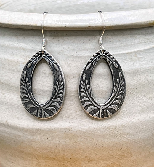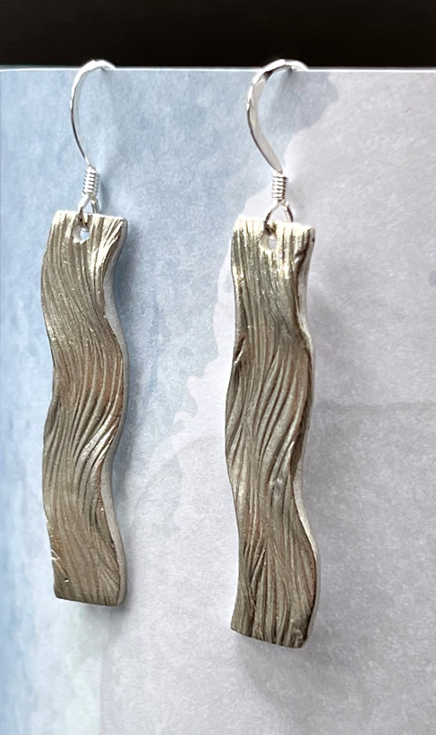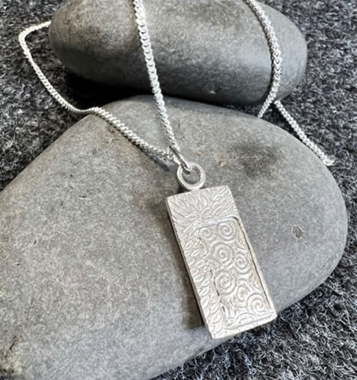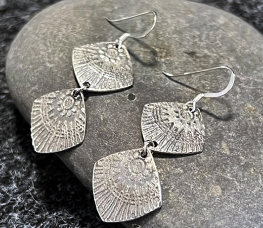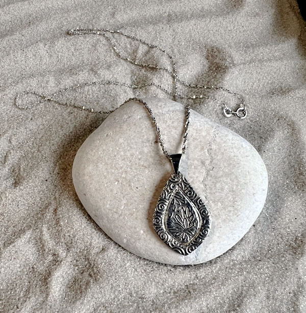 Originating in Japan in 1990, PMC can be shaped just like any soft clay, by hand, using molds and applying textures. After drying, the clay can be carved and then finely sanded. It is then fired in a variety of ways such as in a kiln, or with a handheld torch. The clay binder then burns away, leaving the pure sintered metal. In the case of silver, it results in 99.9% pure silver. Some level of shrinkage occurs during firing and needs to be factored in for the pieces. After being fired, the metal is finished to the desired effect, highly polished, satin, or antiqued.
